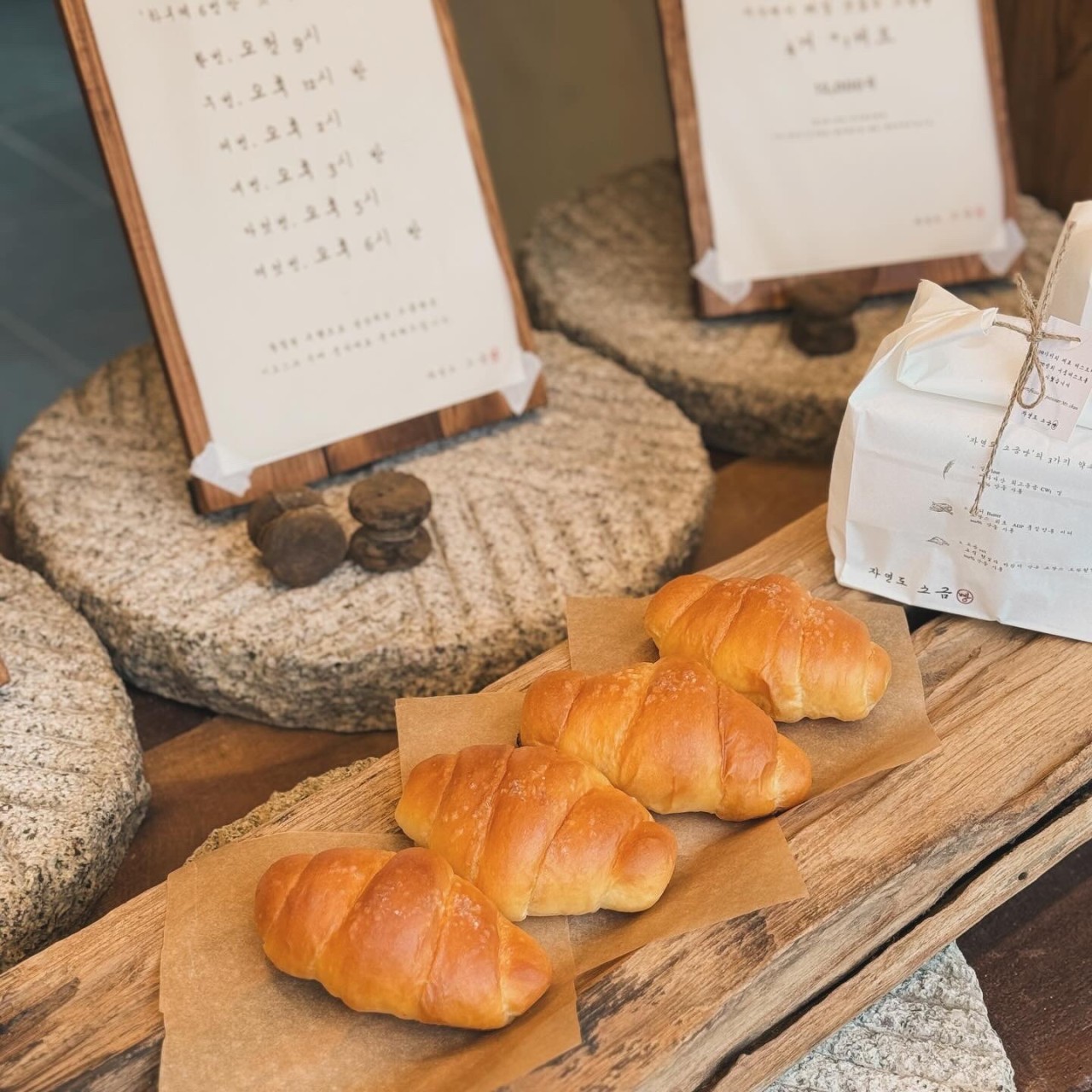 투박하고 담백한 비주얼의 소금빵이 특징. 버터 향과 소금 간의 조화가 적절하며, 넓은 매장 덕분에 웨이팅 부담 없이 다양한 빵을 즐길 수 있다.
