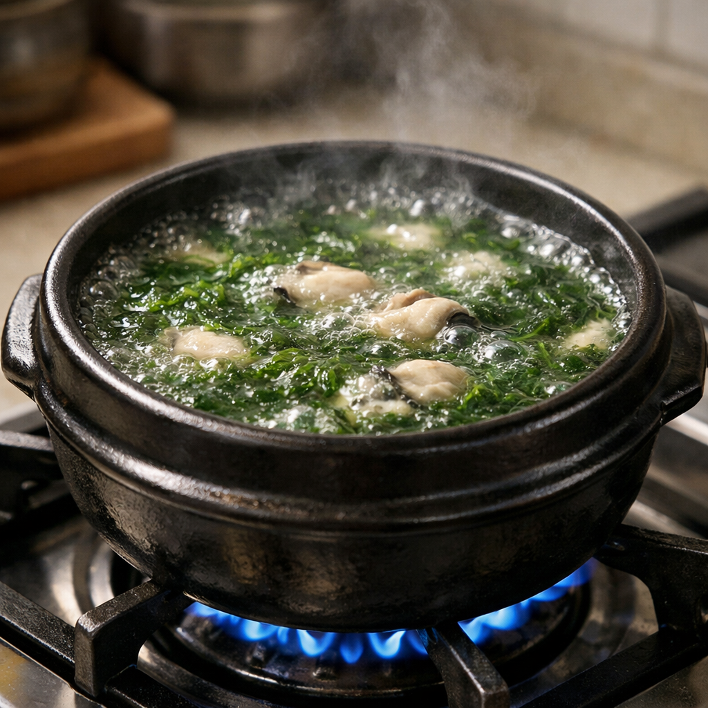 육수를 먼저 끓이고 재료를 넣는 방식과, 재료를 볶다가 물을 붓는 방식이 있다. 오늘은 국물의 깊이감을 극대화하고 굴의 탱글함을 살리는 '참기름 볶음 후 육수' 방식을 추천한다.