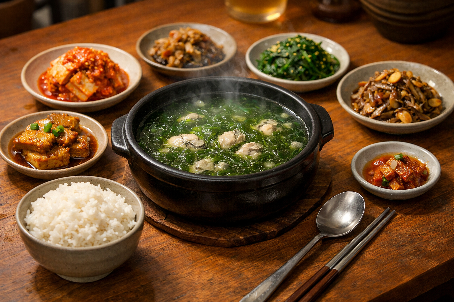 완성된 매생이굴국을 한 술 뜬다. 첫맛은 바다 그 자체다. 참기름에 볶아낸 굴에서 우러나온 고소함이 베이스를 잡고, 멸치 육수의 시원함이 그 위를 감싼다.