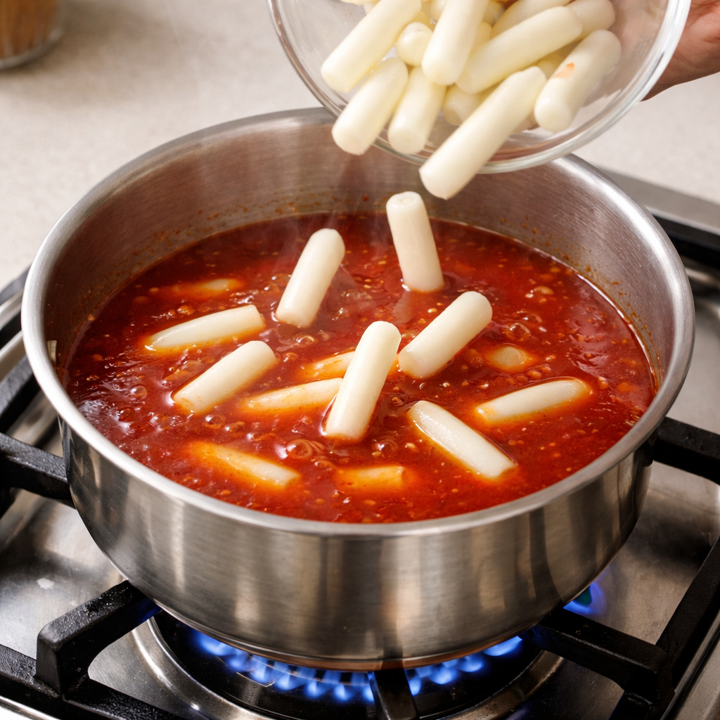 떡이 아직 딱딱하다면 물을 50ml 정도만 추가해준다. 처음부터 물을 많이 넣으면 나중에 국물이 싱거워질 수 있다.
