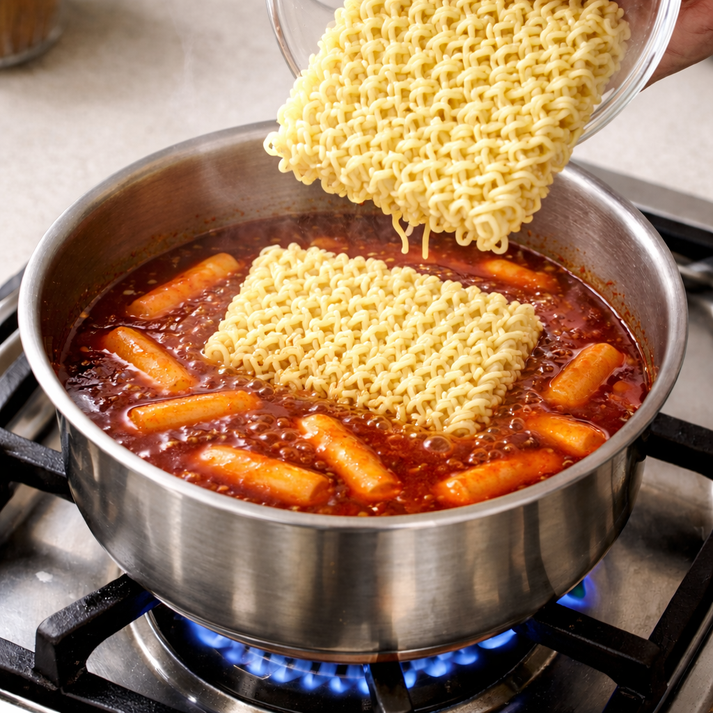 떡 → 어묵 → 라면 순서로 넣어 식감이 망가지지 않는다.