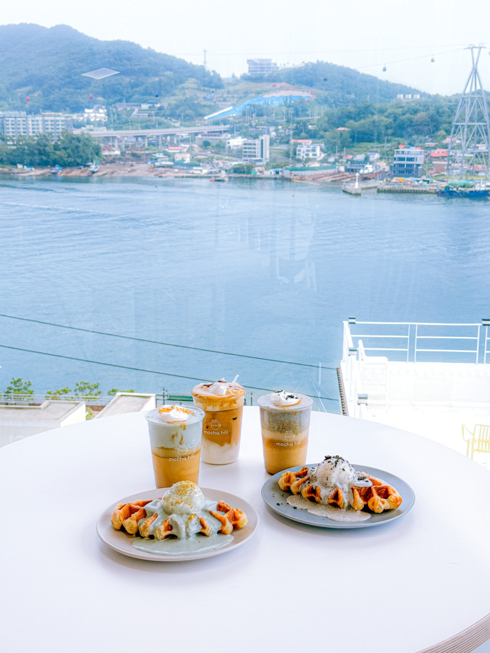 광장 위쪽에서 바다를 넓게 보는 카페 카페모카힐 이순신광장점은 전 좌석에서 바다를 볼 수 있는 구조다. 창이 넓게 나 있어 어느 자리에 앉아도 시야가 막히지 않는다. 낮에는 밝은 바다 풍경이 중심이고, 해 질 무렵부터는 노을과 조명이 분위기를 바꾼다.