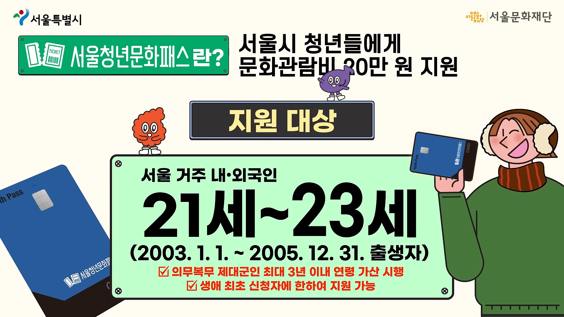예산이 한정된 사업인 만큼, 대상에 해당한다면 망설이기보다 빠르게 신청하는 것이 유리하다. 2026년, 문화로 일상을 채우고 싶은 청년이라면 서울청년문화패스는 충분히 주목할 만한 선택지다.