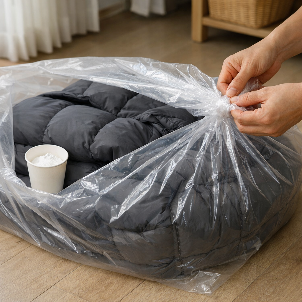 큰 비닐봉지나 이불 커버를 준비한다. 베이킹소다 2~3큰술을 작은 종이컵에 담는다. 패딩과 함께 봉투 안에 넣고 입구를 꽁꽁 묶는다. 그대로 8시간에서 12시간 둔다. 꺼내서 가볍게 털고 환기만 하면 끝이다.