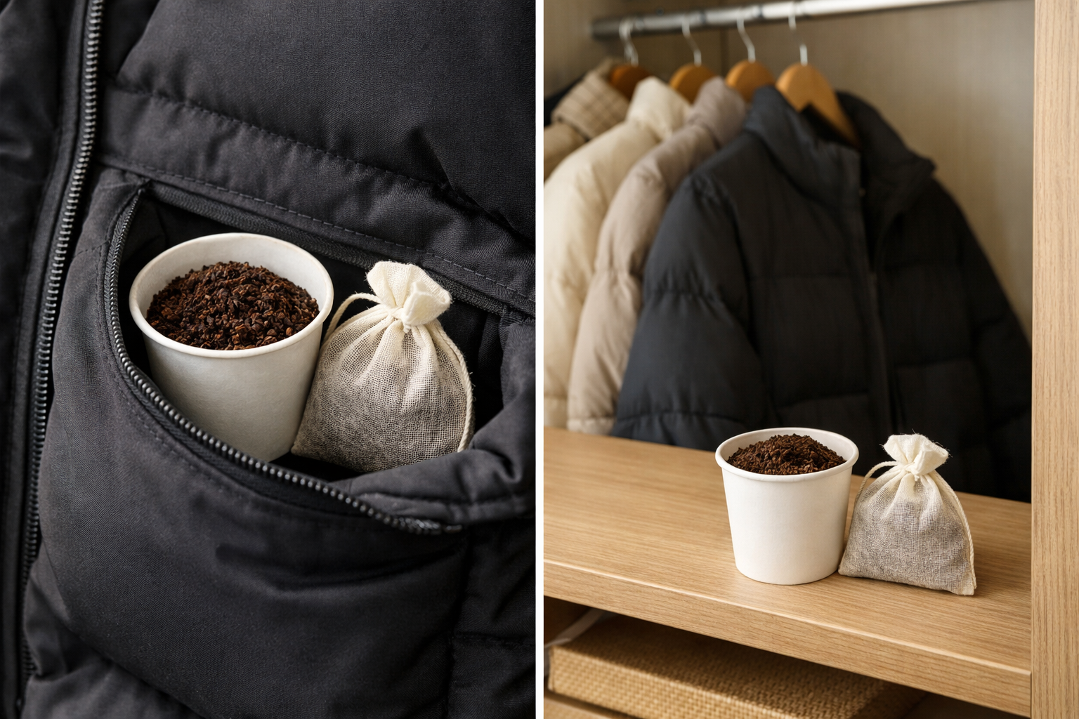 종이컵이나 티백에 담아서 패딩 주머니 안에 넣어두거나 옷장에 같이 둔다. 음식 냄새, 땀 냄새가 줄어들고 은은한 커피 향이 남는다. 일주일에 한 번 정도 새 찌꺼기로 바꿔주면 효과가 계속 유지된다.