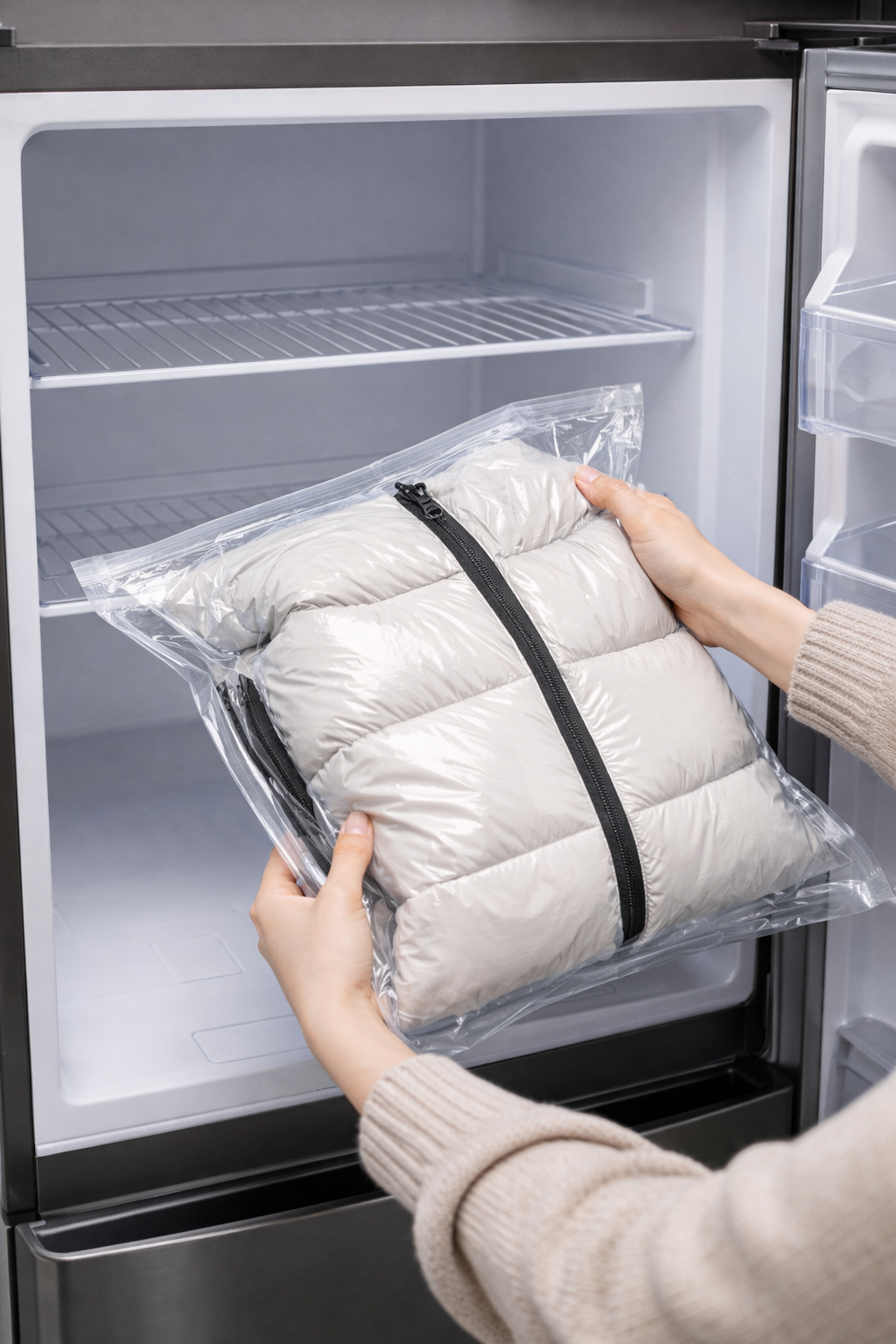 차갑게 식으면서 냄새를 만드는 세균 활동이 줄어든다. 단, 냉동실이 깨끗하지 않으면 오히려 다른 냄새가 밸 수 있다. 냉동실 공간이 부족하면 모자나 목도리 같은 작은 소품부터 시도해보는 것도 방법이다.