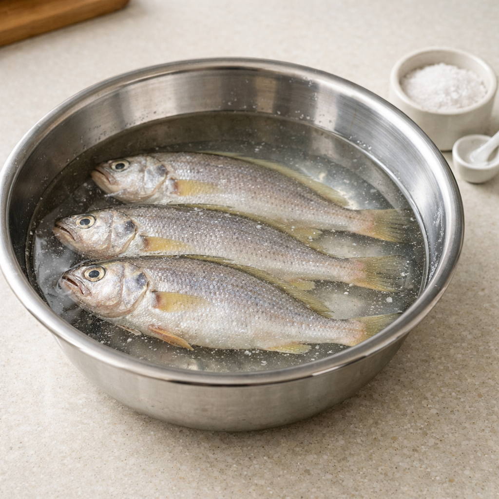 차례상에 올릴 조기 세 마리. 냉동실에서 꺼내 소금물에 30분간 담가 해동한다. 이 과정에서 생선 표면의 핏물과 잡내 성분이 함께 빠진다. 소금은 삼투압 작용으로 생선 내부의 수분을 끌어내고, 동시에 냄새 성분도 함께 빠져나오게 만든다.