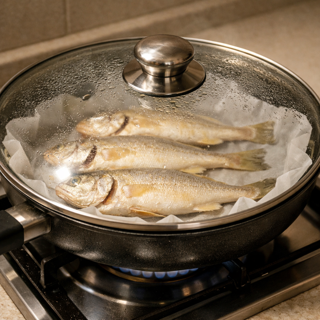온도도 중요하다. 생선 내부 온도가 55~60℃일 때 가장 촉촉하고 맛있다. 그 이상 올라가면 수분이 빠지면서 퍽퍽해지고, 동시에 냄새도 더 많이 난다. 중불에서 뚜껑을 덮고 구우면 이 온도를 정확히 맞출 수 있다.