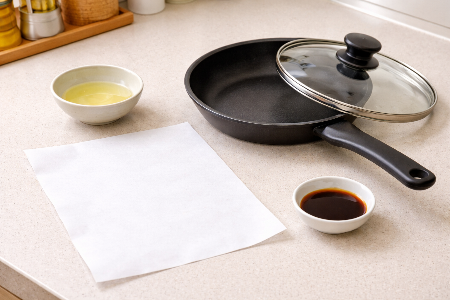 식초 또는 레몬즙 한 스푼, 종이호일 한 장, 뚜껑 있는 프라이팬, 간장 한 스푼.