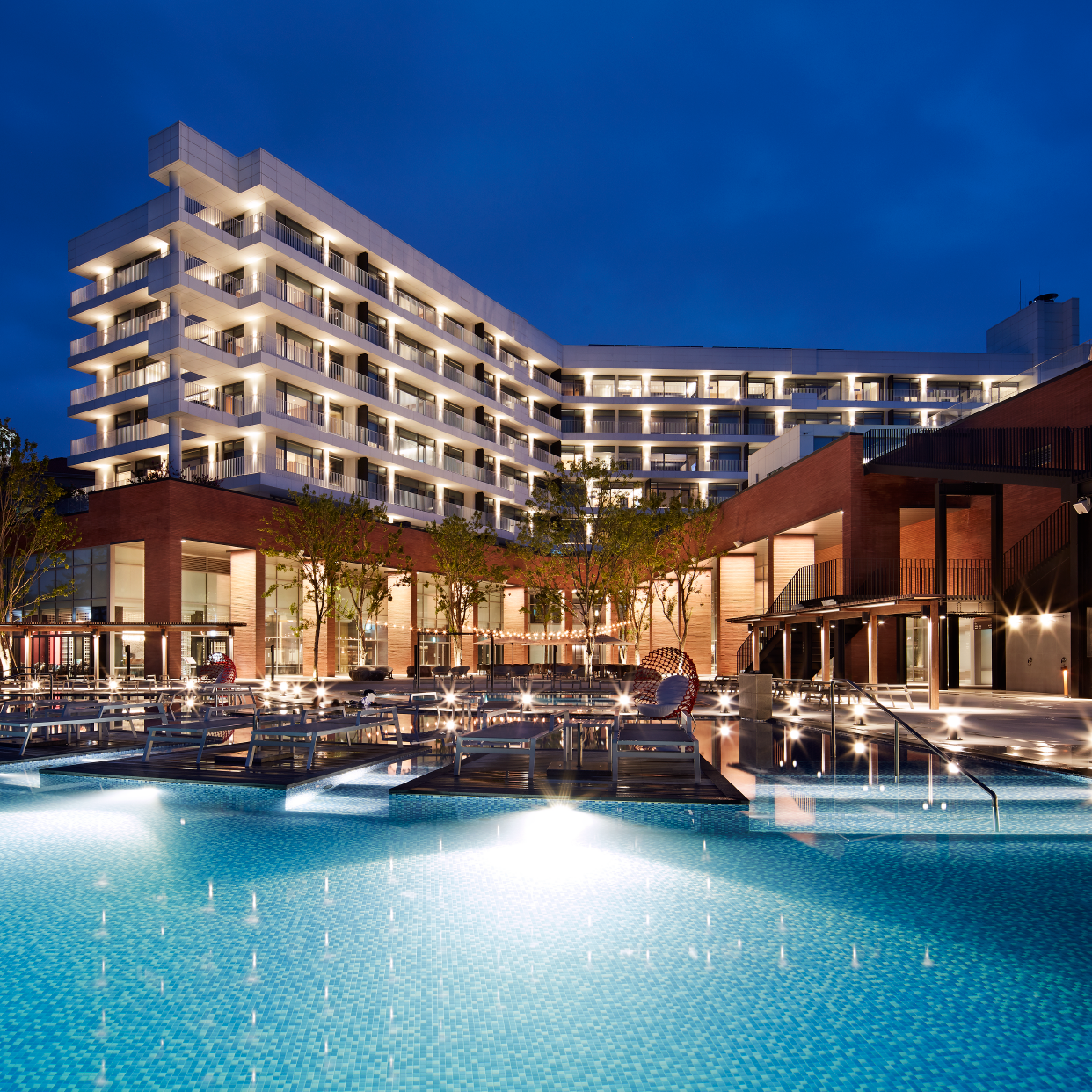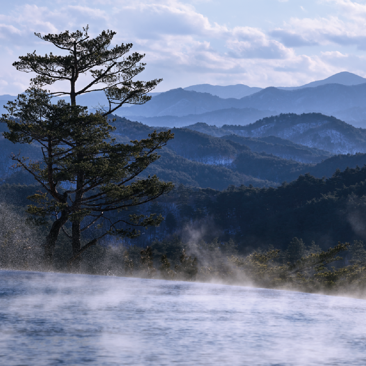 설악산 동쪽 사면의 완만한 숲 능선을 따라 건물이 층층이 올라앉고, 가장 높은 지점의 노천탕에서는 숲과 공항 활주로, 멀리 동해 방향까지 시야가 길게 열린다. 겨울 공기가 얼굴을 스치고, 뜨거운 온천수의 수증기가 몸을 감싸는 순간 동선은 자연스럽게 느려진다.