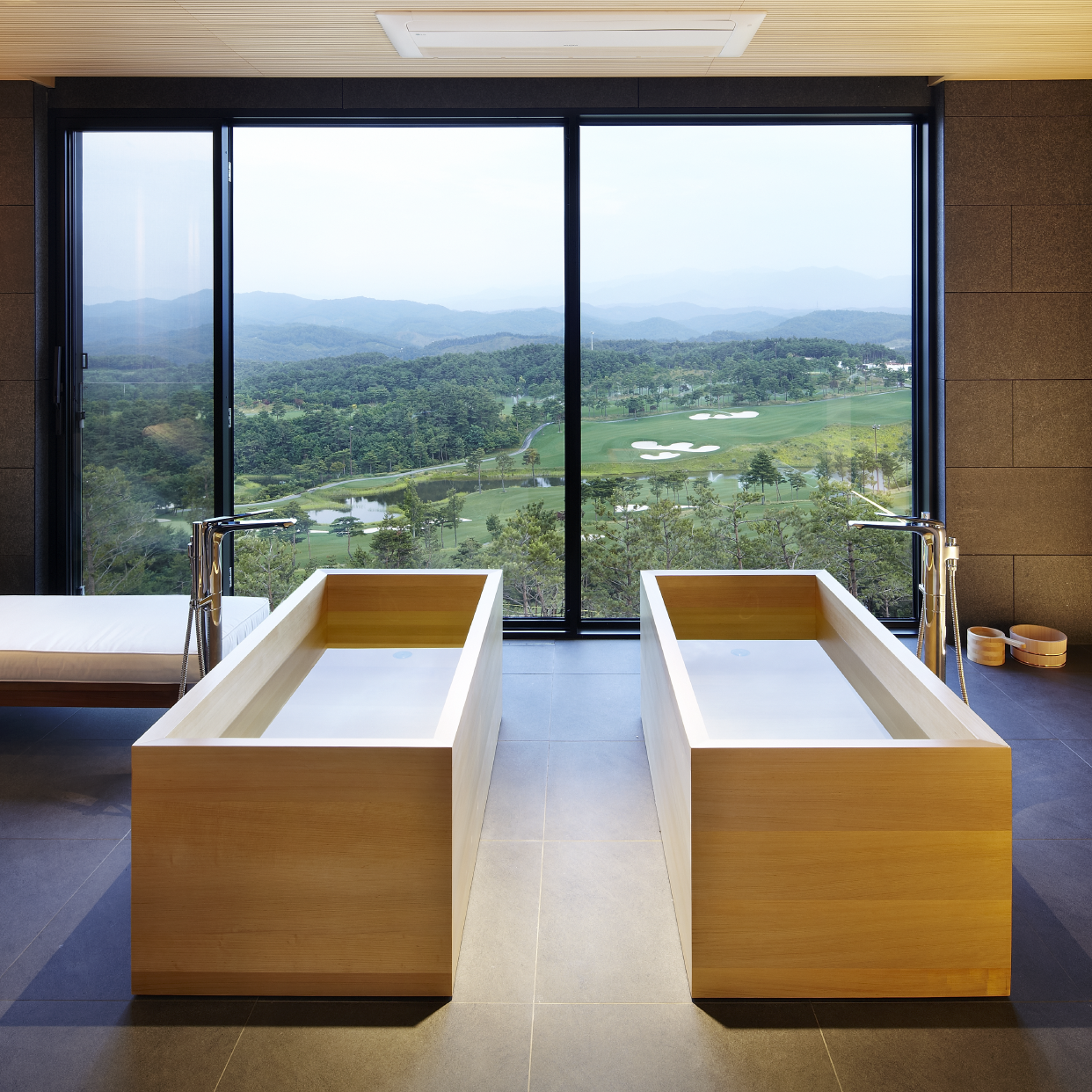 숲 전망 노천탕에서 즐길 수 있는 리조트형 온천.