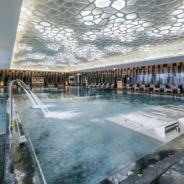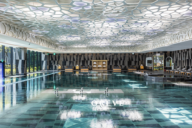 지하 2,003m, 국내에서도 손꼽히게 깊은 지점에서 끌어올린 유리탄산 온천수를 쓰고, 이 온천수가 바데풀·키즈풀·야외 인피니티풀·노천탕·대욕장까지 사실상 모든 물의 기반이 된다. 한마디로, “수영장이 아니라 온천이 깔린 스파 단지”에 가깝다.