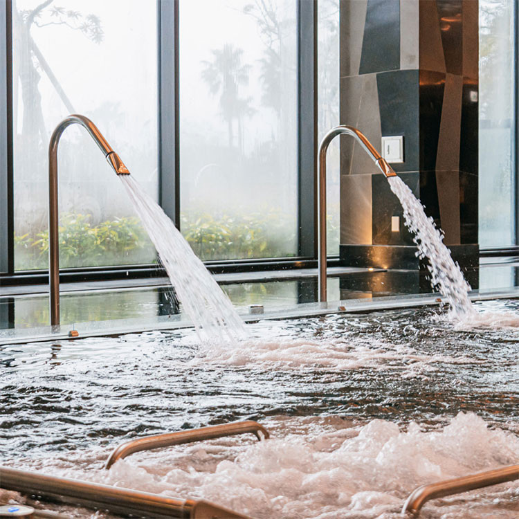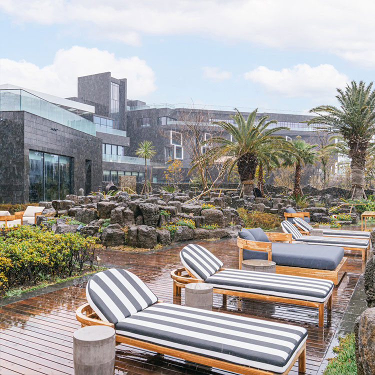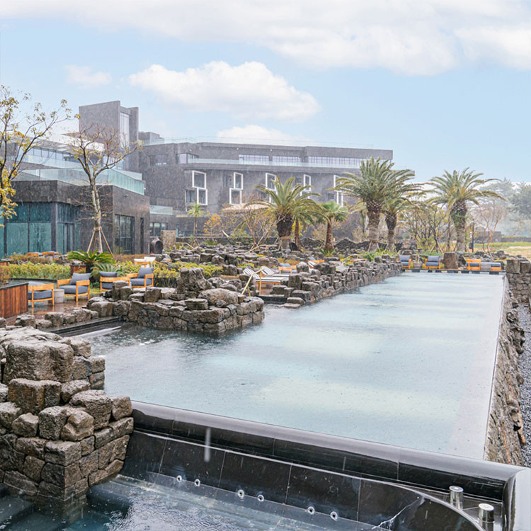 인피니티풀 주변에는 현무암으로 만든 작은 이벤트 스파들이 동그랗게 놓여 있다. 각기 온도와 제트 방향이 조금씩 달라서, 한 바퀴 돌며 “오늘 내 몸에 맞는 자리”를 찾는 재미가 있다. 단순히 풍경을 보는 야외풀이 아니라, “제주 바다를 배경으로 돌면서 온천수를 바꿔 앉는 곳”에 가깝다.