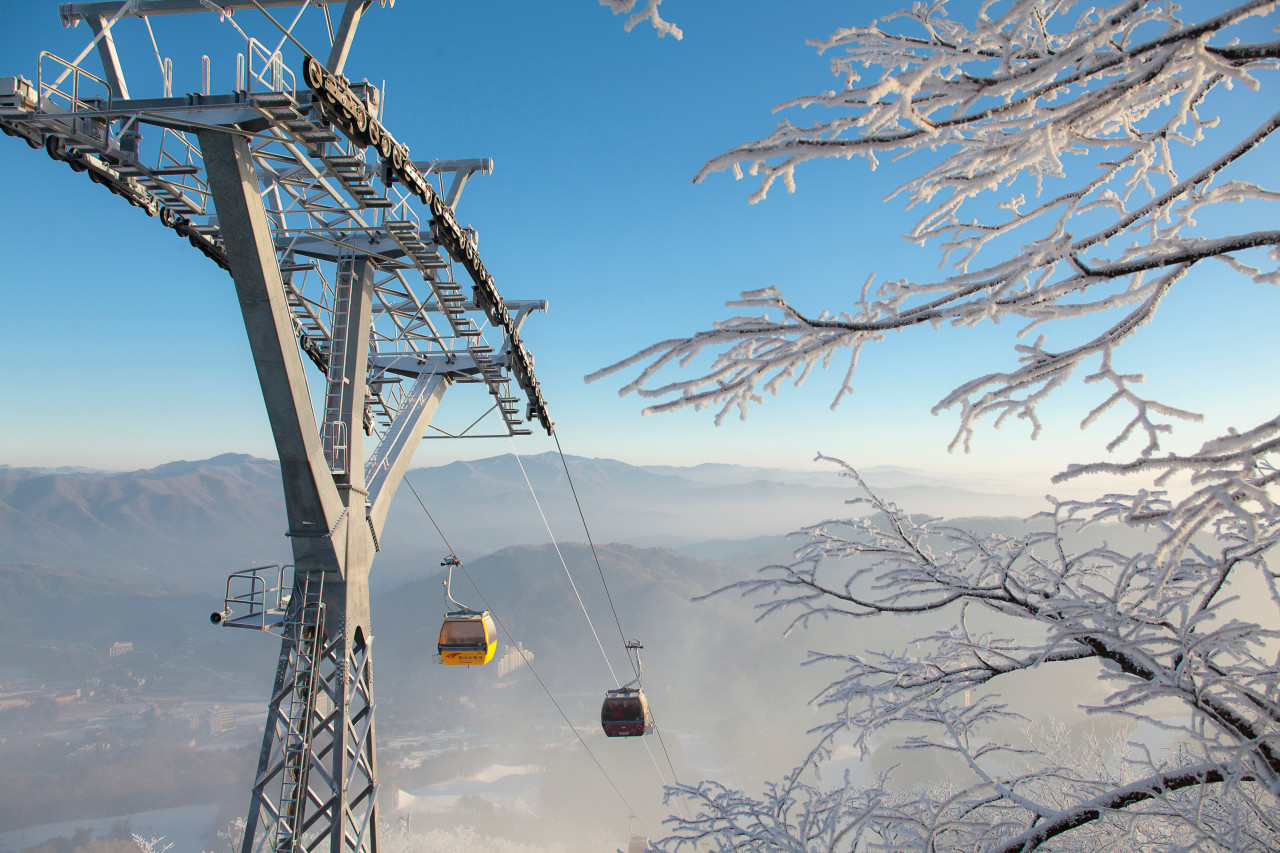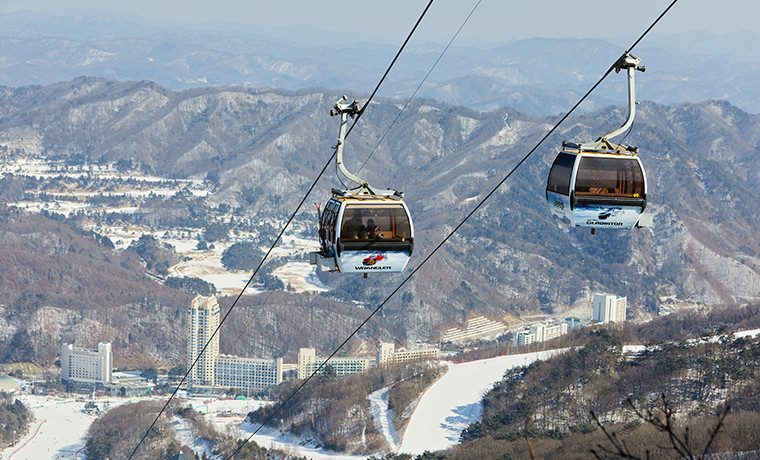 휘닉스파크 곤돌라는 스키 이용 여부와 관계없이 탑승 가능한 관광형 곤돌라다. 해발 약 1,050m 몽블랑 정상까지 이동하며 설경과 일몰 풍경을 감상할 수 있다.