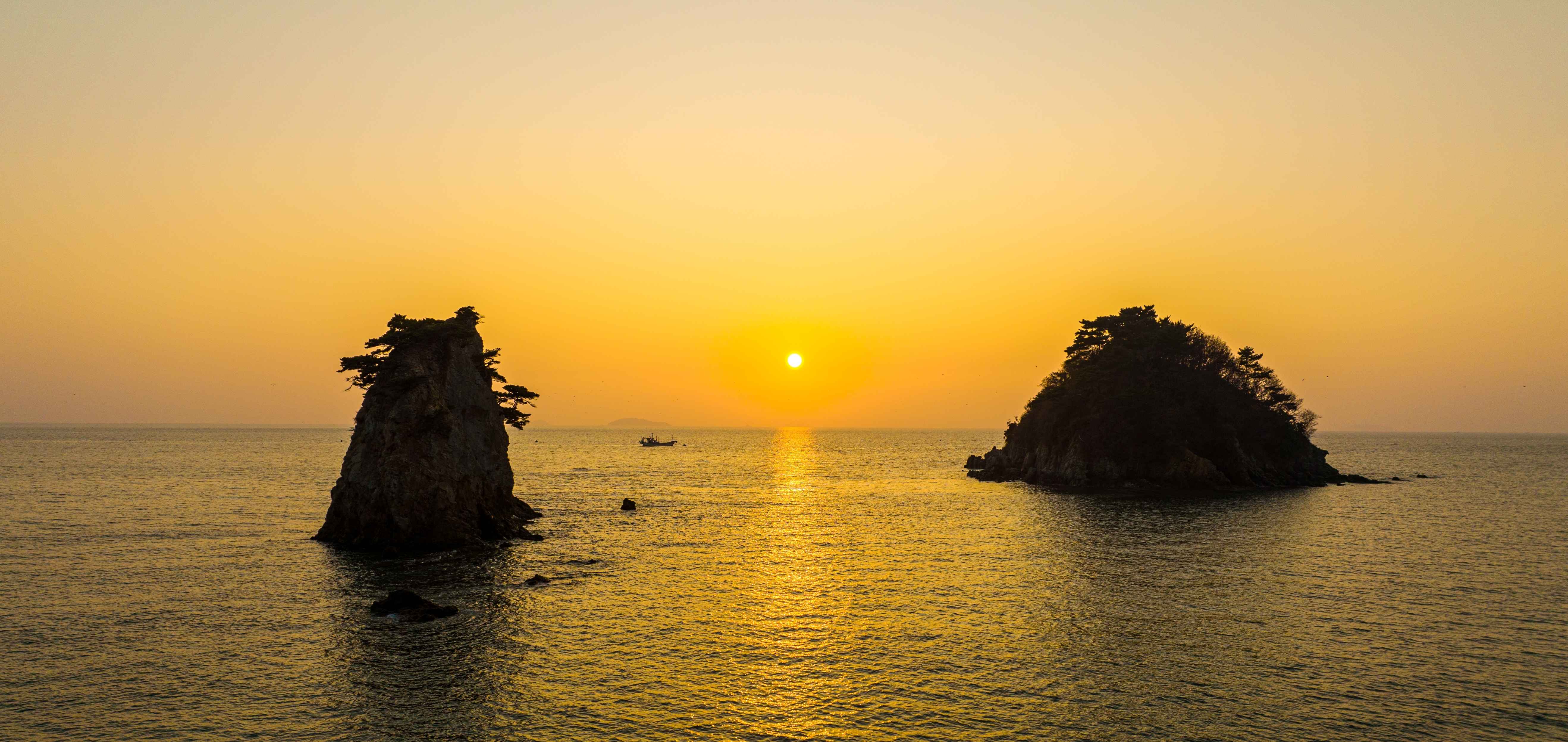 해와 바위가 동시에 남는 서해의 대표 장면