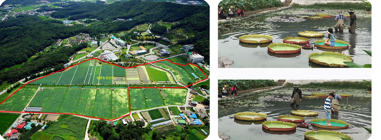 야외로 이어지는 경관농업단지는 약 8.15ha 규모로 조성되어 있다. 연꽃단지가 대표적이며, 시기에 따라 메밀과 보리, 코스모스 등 계절 작물이 바뀌어 풍경을 만든다. 방문 시기에 따라 전혀 다른 장면을 마주하게 되는 이유다.