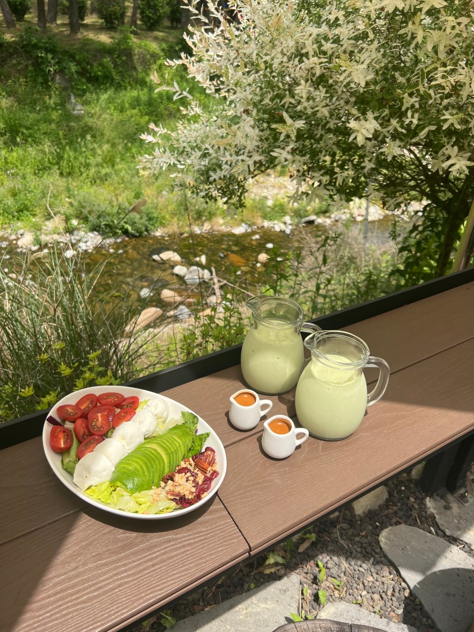 1층과 2층 전면이 통창으로 구성되어 있어 계곡과 야외 테라스가 한눈에 들어온다. 실내에서도 바깥 풍경이 그대로 보이는 구조다. 계곡 테라스와 넓은 앞마당, 꽃이 심어진 1층 외부 공간까지 자연 요소가 함께 배치되어 있다.