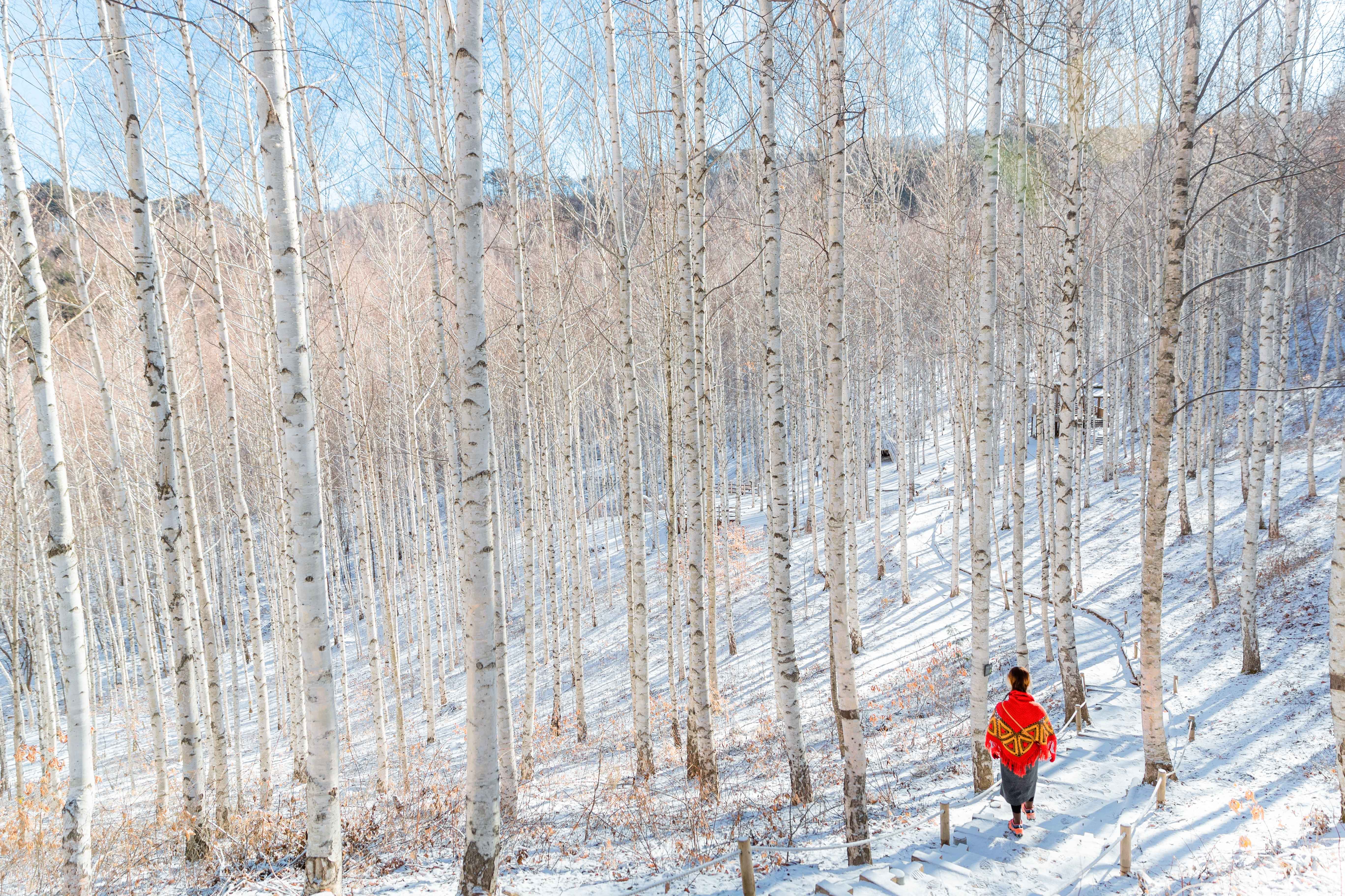 겨울의 자작나무숲은 색감 대비가 가장 뚜렷하다. 자작나무 줄기의 밝은 회백색과 바닥의 설원이 겹쳐지면서 숲 전체가 한 톤으로 정리된다.