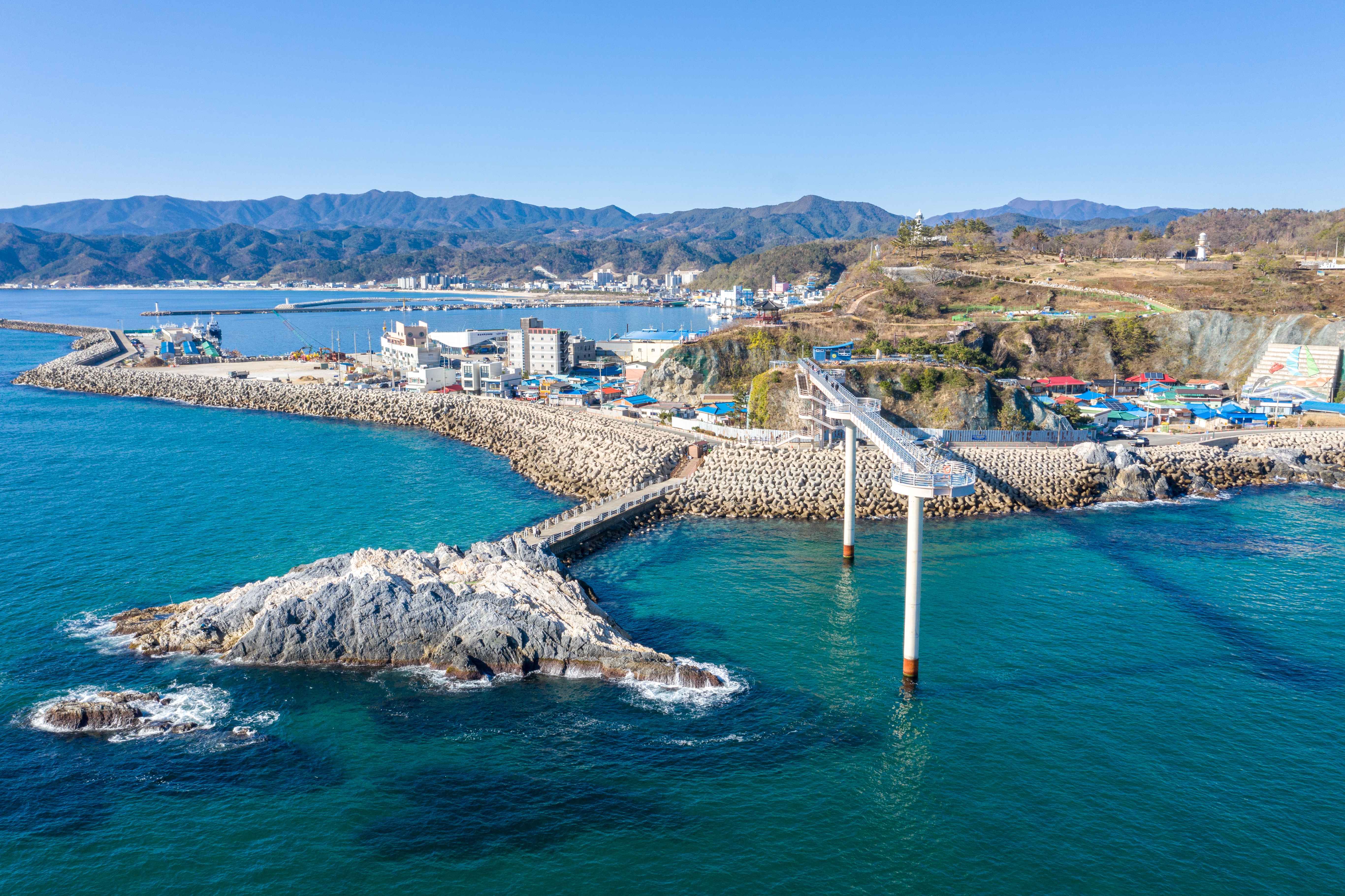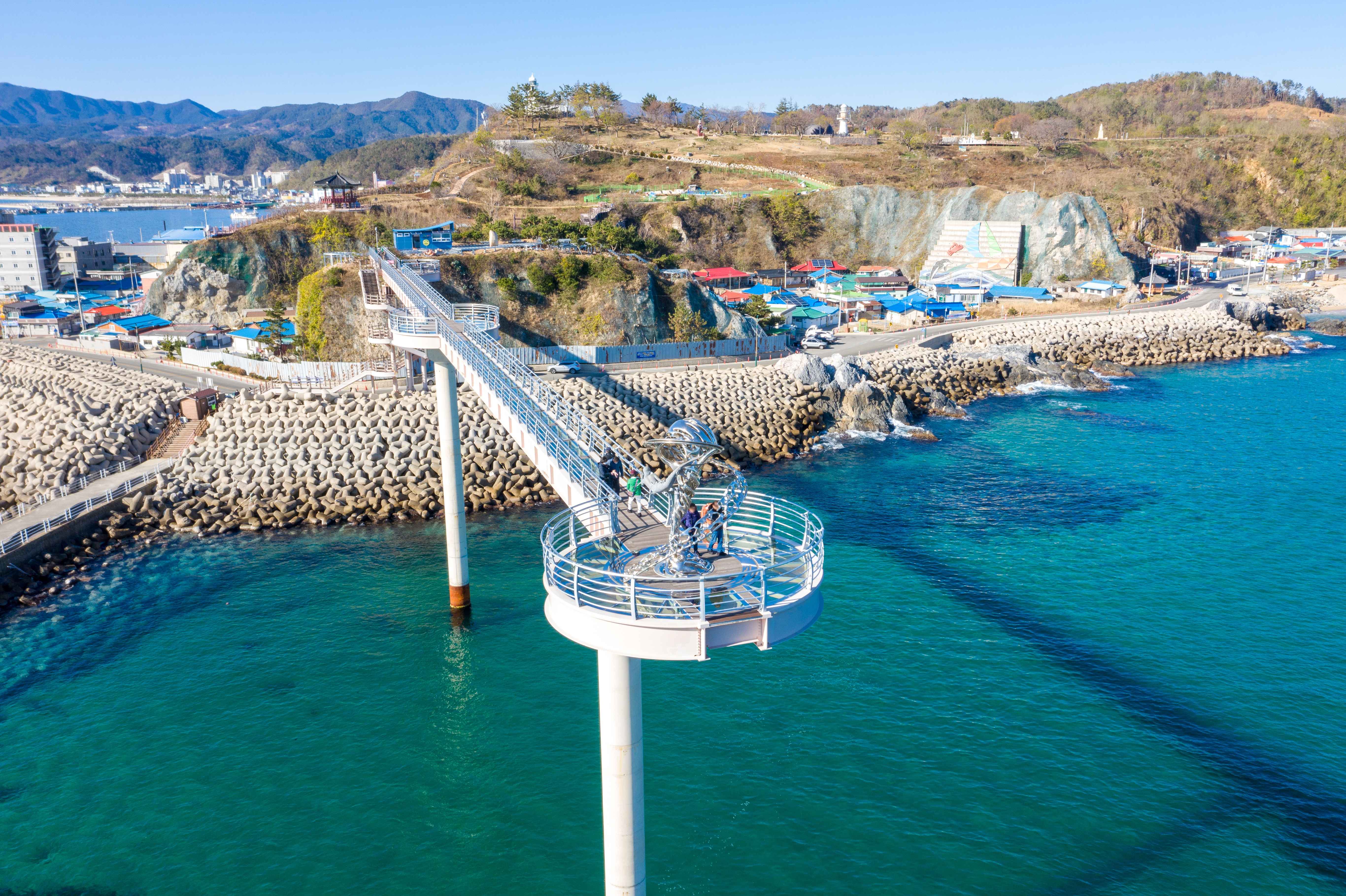 울진군 근남면에 위치한 등기산 스카이워크는 바다 위 70m 높이에 만들어진 전망대다. 길이는 135m이고, 일부 구간은 투명 유리로 되어 있다.