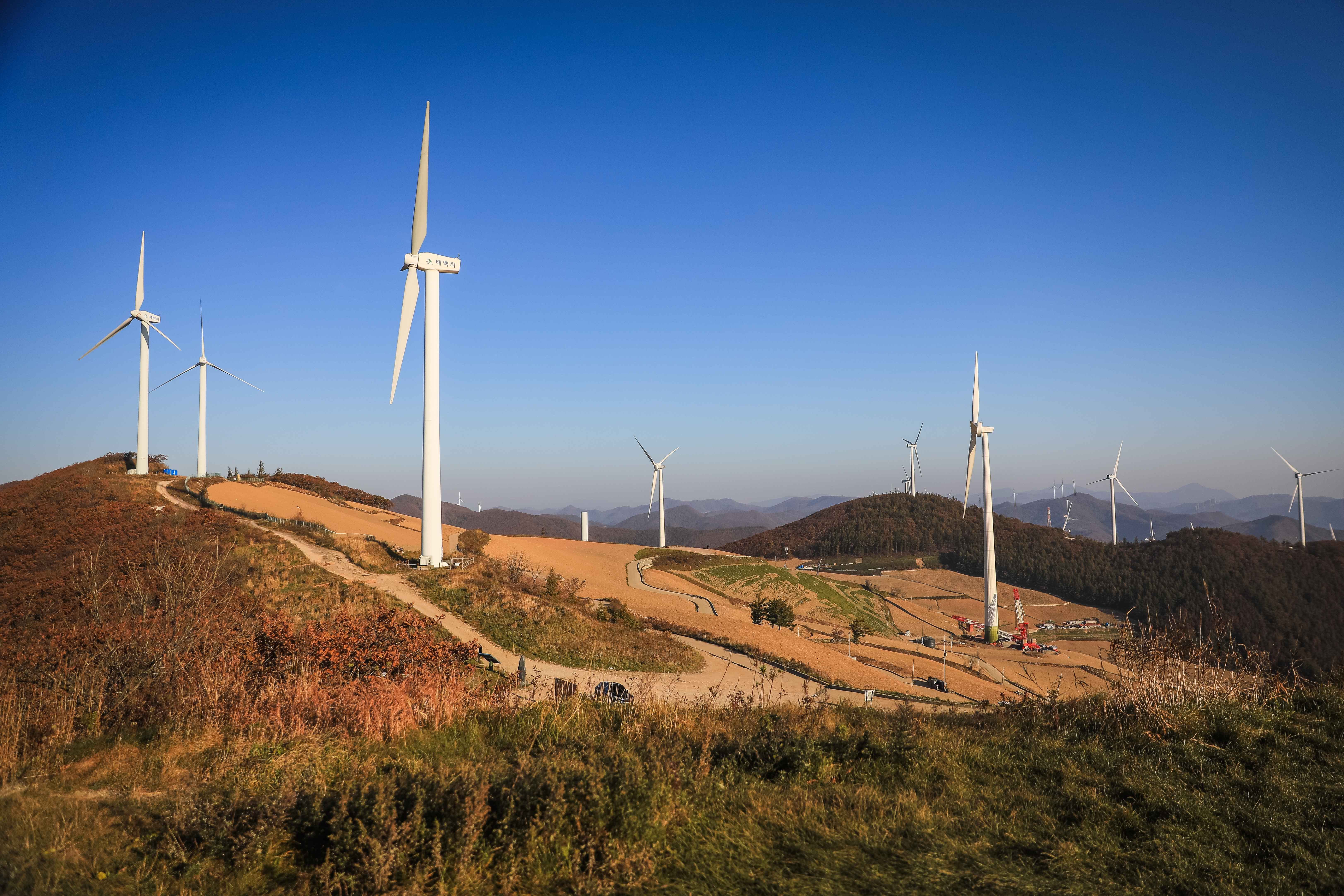 매봉산 정상까지는 200미터가 채 남지 않았다. 걷기 시작한 지 3분쯤 지나자 시야가 트이고, 거대한 풍력발전기 8기가 일렬로 서 있는 모습이 눈앞에 펼쳐졌다.