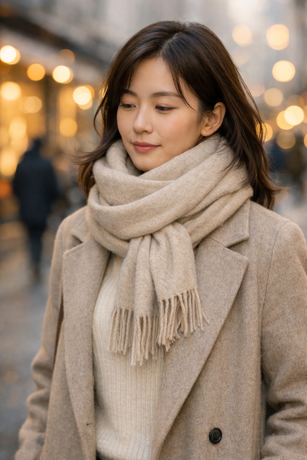 두껍지 않은 머플러 사용 시 과한 부피 없이 겨울 분위기를 더할 수 있다.