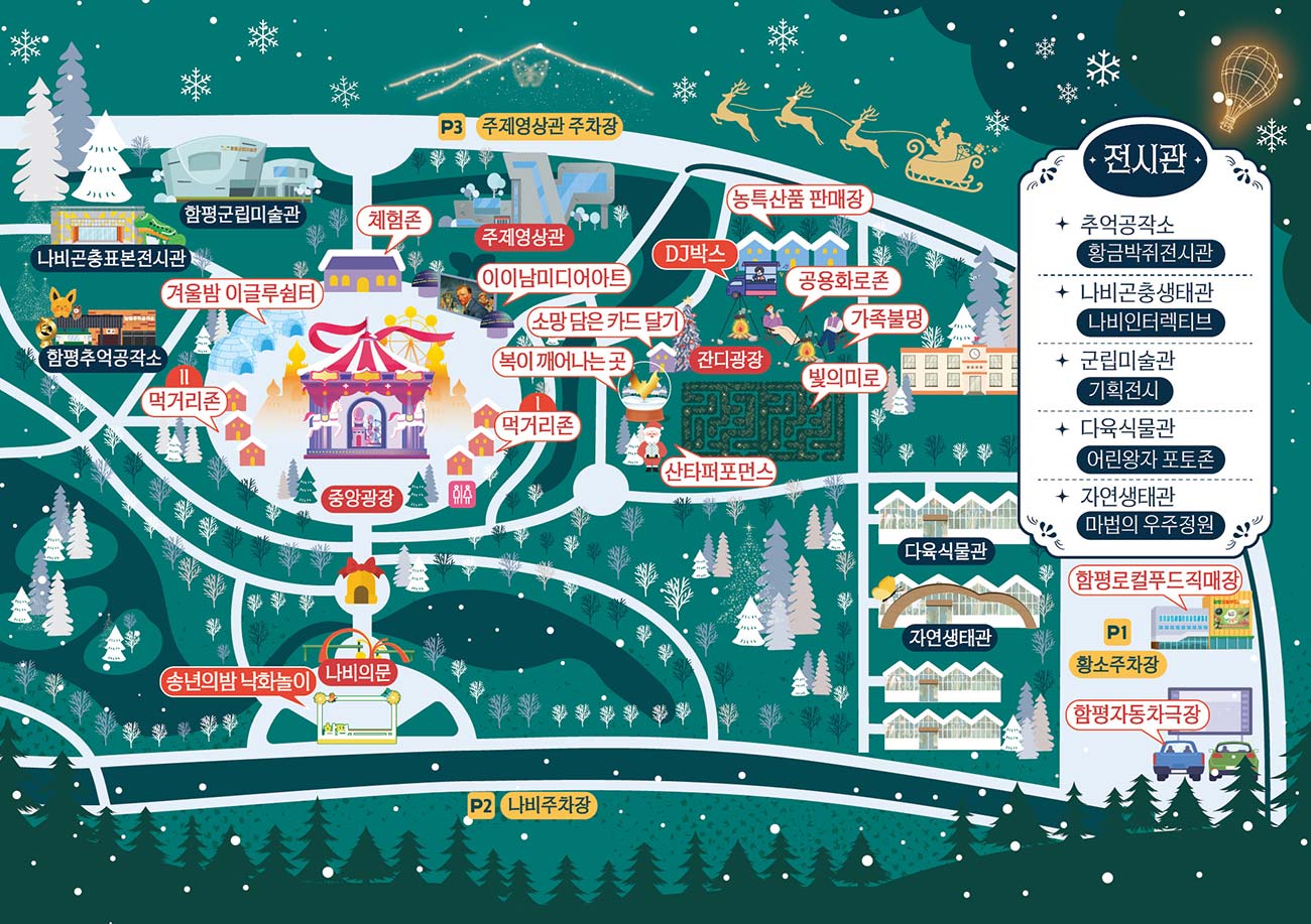 2025–2026 함평 겨울빛축제는 전라남도 함평군에 위치한 함평 엑스포공원 일원에서 열린다. 공원 자체 규모가 넓어 동선이 여유롭고, 야간 관람을 중심으로 구성돼 천천히 걸으며 즐기기 좋다.