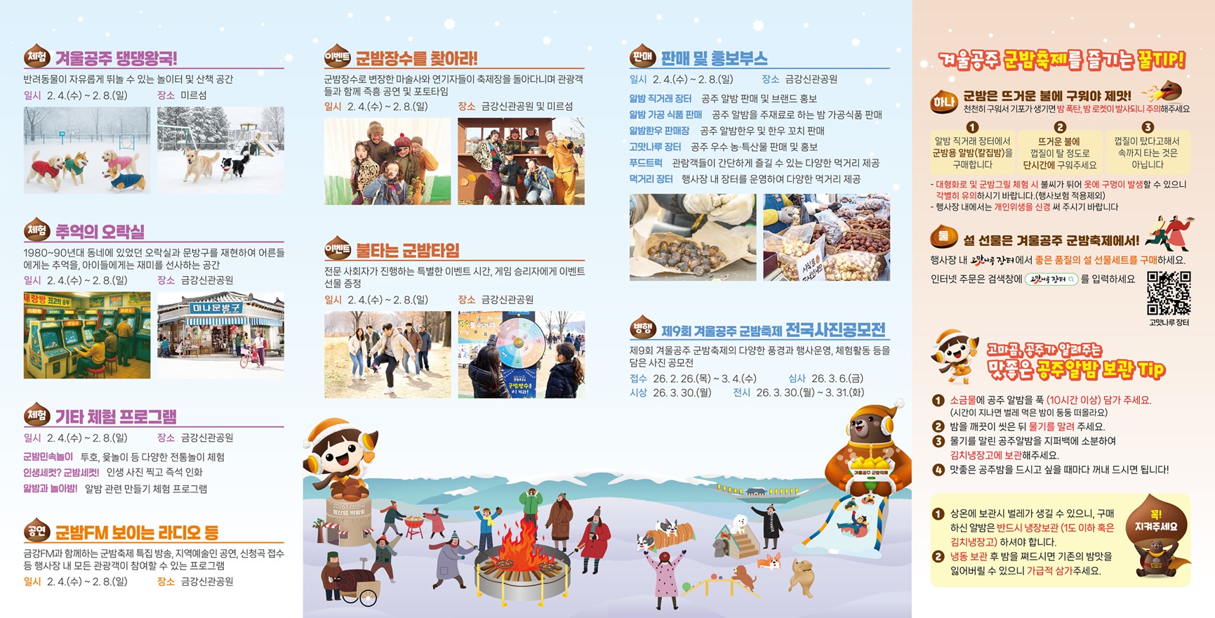 겨울공주 군밤축제는 공주 알밤의 맛과 겨울 축제의 분위기를 동시에 즐길 수 있는 행사다. 단순히 먹고 끝나는 축제가 아니라, 체험과 전시, 놀이가 어우러진 일정으로 구성돼 겨울철 공주 여행 코스로 넣기 좋다.