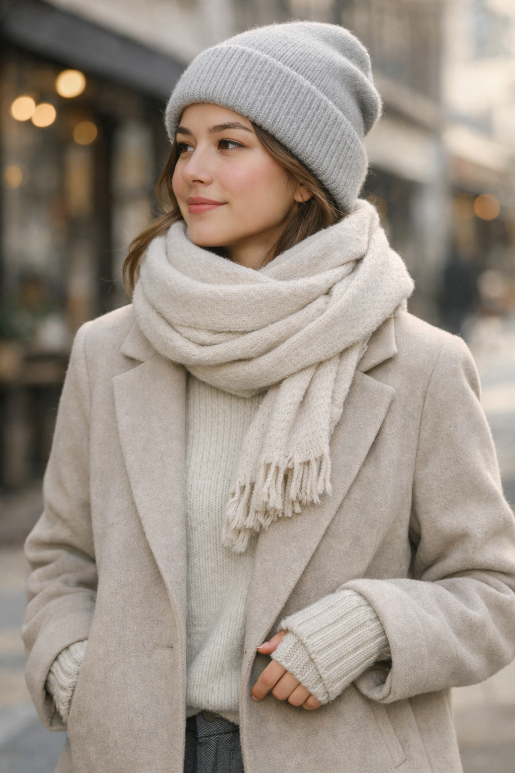 겨울 액세서리의 출발점은 비니다. 머리와 귀를 동시에 감싸주는 실용성은 기본이고, 얼굴 윤곽을 부드럽게 정리해 주는 역할이 크다. 니트 비니 특유의 포근한 질감은 두꺼운 아우터가 주는 무게감을 자연스럽게 중화시킨다.