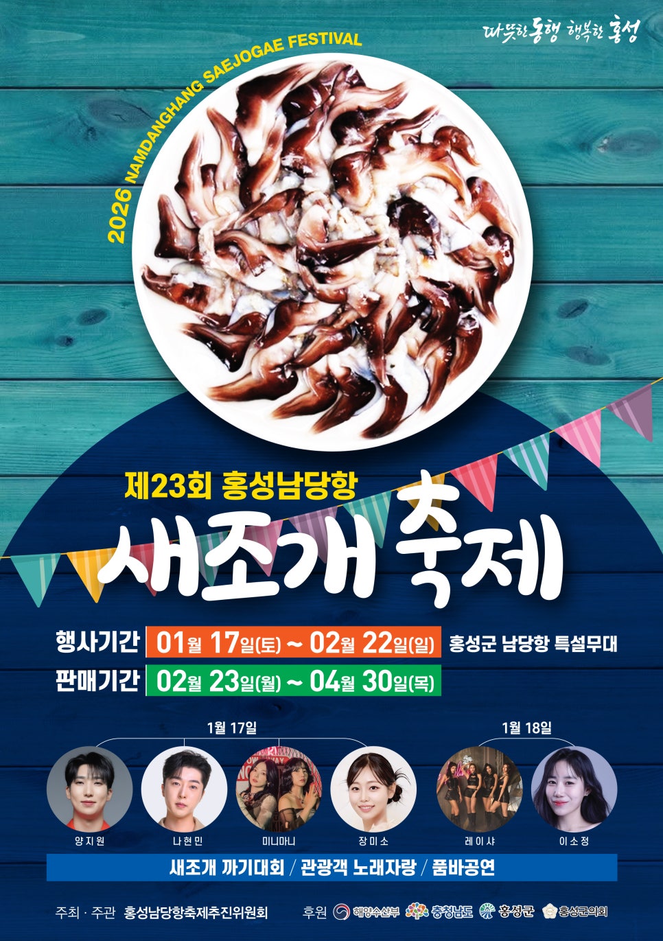 축제 행사 기간은 2026년 1월 17일부터 2월 22일까지로, 공연과 체험 프로그램이 집중된다. 수산물 판매 기간은 2월 23일부터 4월 30일까지 이어져 축제가 끝난 뒤에도 새조개 식사와 구매가 가능하다.