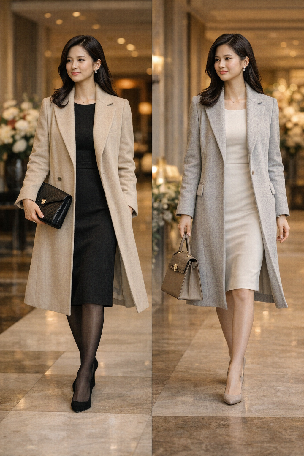 겨울 결혼식에서 남들의 시선에 가장 오래 머무는 아이템은 단연 코트다. 식장에 들어서서 외투를 벗지 않고 인사를 나누는 경우도 많으므로, 아우터 자체가 하나의 드레스처럼 보여야 한다.