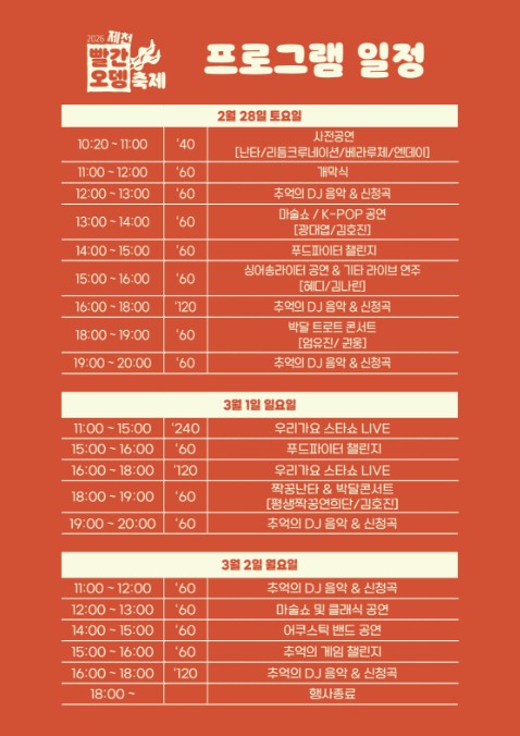제2회 제천빨간오뎅축제는 2026년 2월 28일(토)부터 3월 2일(월)까지 3일간, 매일 오전 11시부터 오후 8시까지 열린다.
